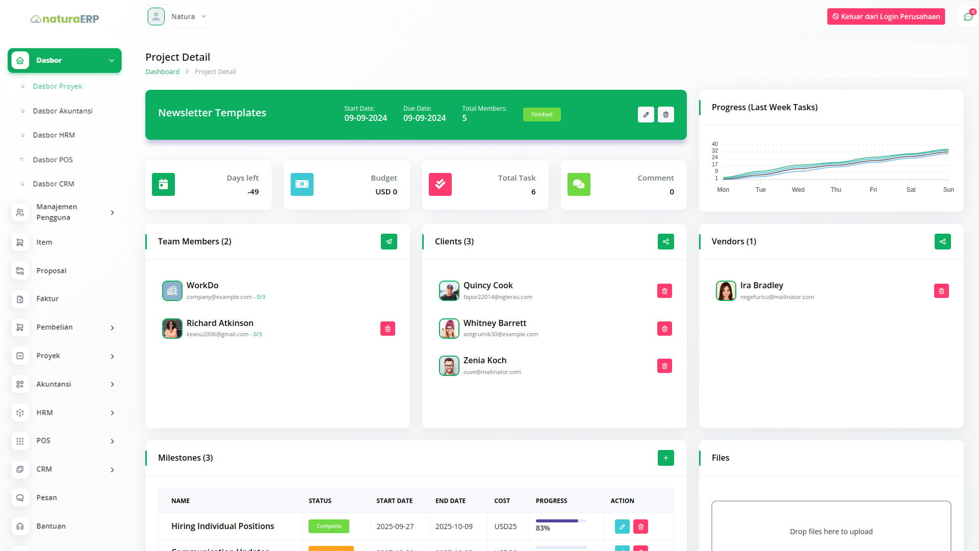 Lampirkan biaya dan ringkasan ke pencapaian dan ubah status melalui menu tarik-turun. Dapatkan tab tentang aktivitas terkini suatu proyek dan juga grafik kemajuannya. Bersamaan dengan itu, Anda dapat memeriksa detail tugas Anda di bawah detail proyek dengan bantuan Gantt Chart.