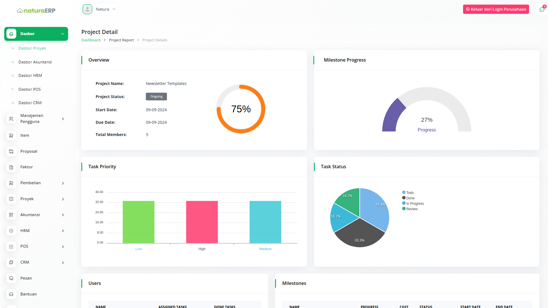 Dapatkan gambaran umum tentang jumlah total proyek, tugas, bug, dan anggota. Representasi visual dari ikhtisar tugas dan status proyek dapat membantu Anda memperkirakan kemajuan setiap tugas. Terakhir, Anda dapat memeriksa tugas teratas yang harus diselesaikan.
