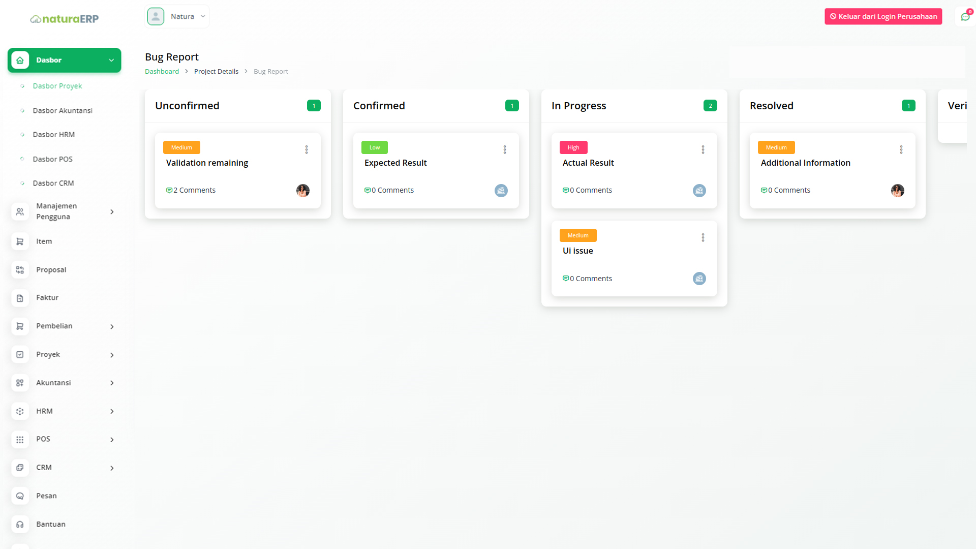 Buat bug baru dan tetapkan pengguna serta prioritasnya. Anda dapat menulis catatan di kotak teks untuk deskripsi bug. Selain itu, status setiap bug dapat diubah melalui sistem drop-down dan drag Kanban yang mudah.